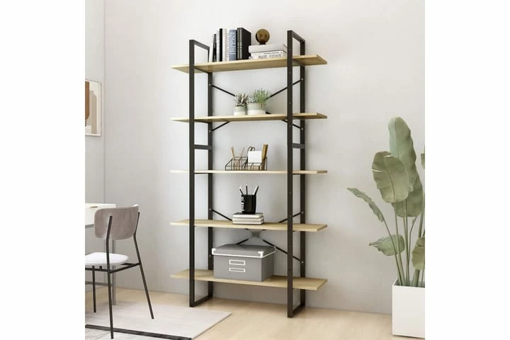 Bokhyllen er laget av kvalitets sponplate og metallramme, som sikrer stabilitet, holdbarhet og langvarig bruk. Den har 5 hyller som gir god lagringsplass for å plassere bøker, blader og andre dekorative gjenstander. Bokhyllen er enkel å rengjøre med en fuktig klut.
