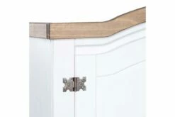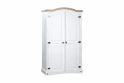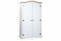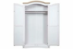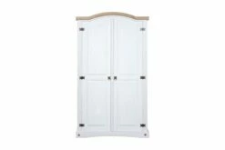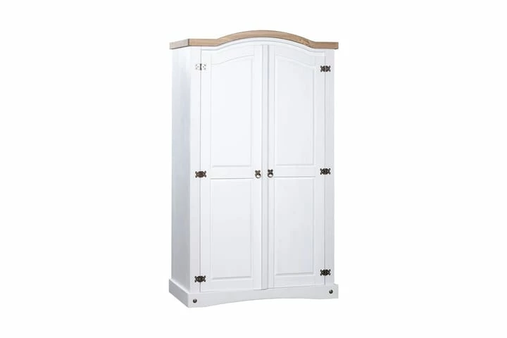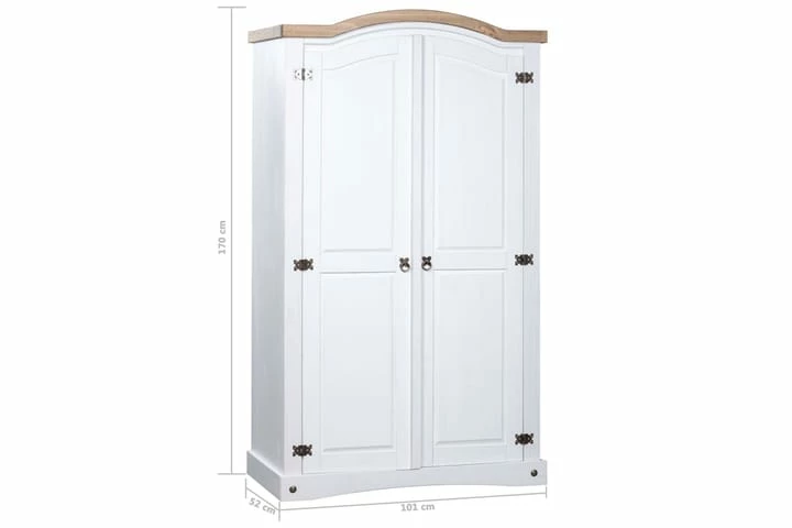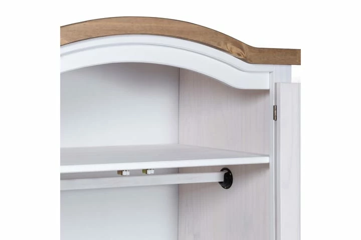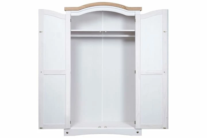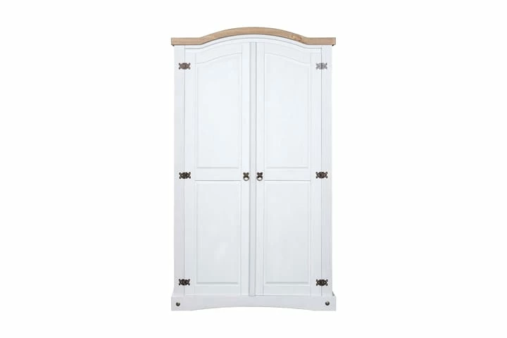 Farger: hvitt eksteriør og brun bordplate. Materiale: heltre furu. Dimensjoner: 101 x 52 x 170 cm (L x B x H). Buet toppdesign med 2 dører. Med 1 topphylle og 1 klesstang. I tråd med den meksikanske Corona-stilen. Enkel montering.