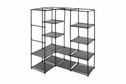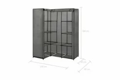Denne praktiske hjørnegarderoben er en ideell oppbevaringsløsning for klær og sko. Den er preget av en solid jernramme, noe som gjør klesstativet svært holdbart. Sammenlignet med et normalt stoffskap, er strukturen på hjørneskapet enda mer stabilt. Den plassbesparende garderoben optimaliserer bruken av et hjørne, og tilbyr derfor stor lagringsplass og hengemuligheter for å holde vesker, sko og småting organisert og innen rekkevidde. Stofftrekket med glidelås beskytter klærne dine mot smuss og støv. Farge: grå Mål: 130 x 87 x 169 cm (B x D x H) Materialer: jernrør + 100% polyester ADVARSEL: For å forhindre at produktet velter, må medfølgende festemidler for vegg benyttes
