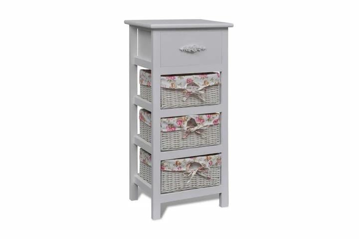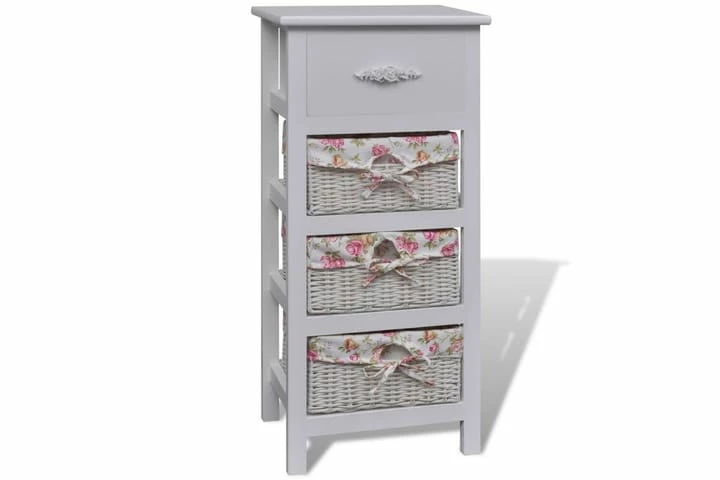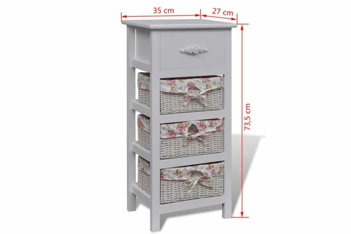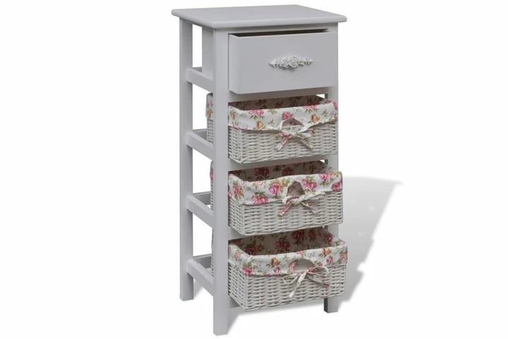 Dette trekabinettet har en skuff og tre kurver som vil tilby rikelig med lagringsplass for verdisaker. Trerammen har en solid topplate hvor du kan stille ut dekorative gjenstander.