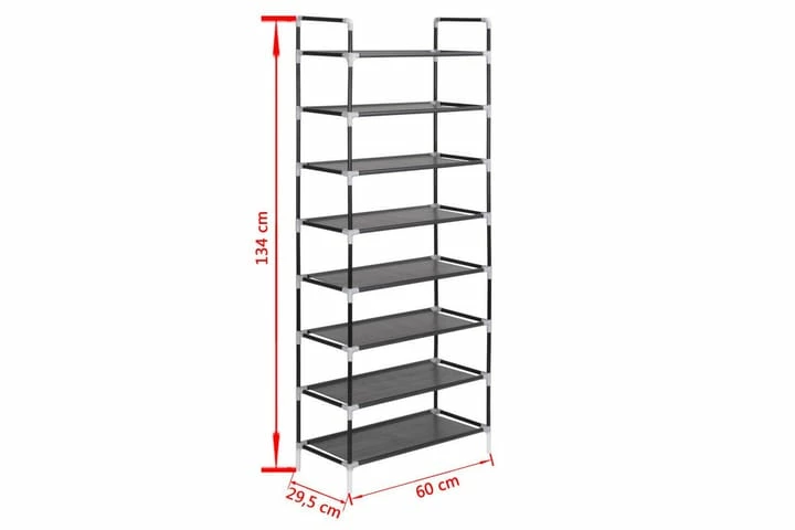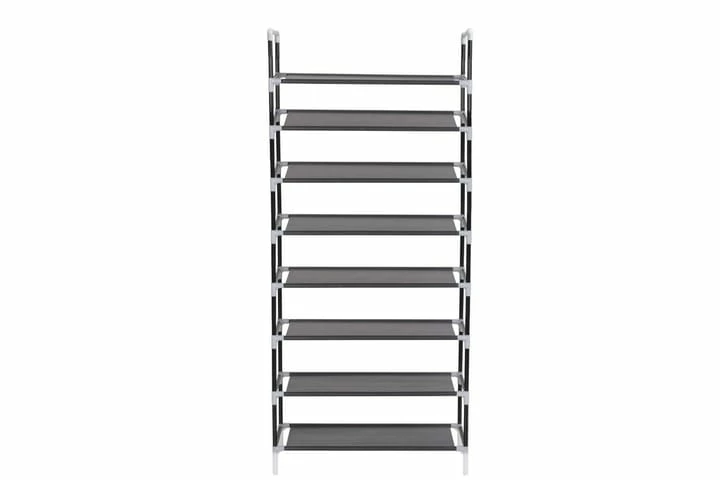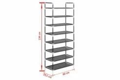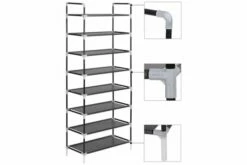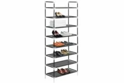 Den har en rørformet metallramme, som er lett men likevel stabil, noe som gjør skoholderen ganske holdbar og enkel å flytte rundt. Den har åtte generøse hyller som er laget av et miljøvennlig, ikke-vevet stoff og har god plass til å holde skoene dine organisert og ute av veien.