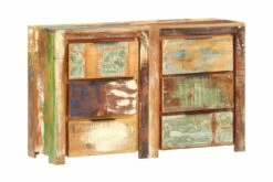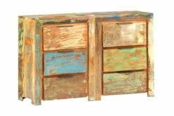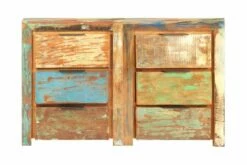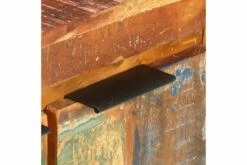 Skuffeskapet er laget av gjenvunnet heltre, hentet fra bjelker, gulv og støttebjelker fra gamle revne bygninger. Det kan bestå av forskjellige tresorter som teak, løvtre, tropisk tre, palisander, mangotre, palisander osv. Dette betyr også at gjenvunnet tre beholder egenskapene til disse forskjellige treslagene. Gjenvunnet tre er allerede eldet, forvitret og tørket. Derfor krymper de ikke eller bøyer seg. Håndverket og de vakre trekornene gjør hvert møbel unikt og litt annerledes enn det neste. Hver skjenk har 3 skuffer, noe som gir god lagringsplass for å holde viktige ting organisert og innen rekkevidde. Viktig merknad: Farger og korn varierer fra stykke til stykke, noe som gjør hvert stykke unikt; hvert stykke leveres med tilfeldig mønster.