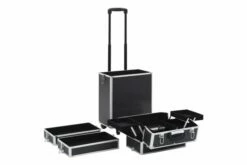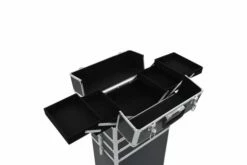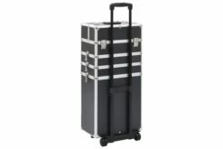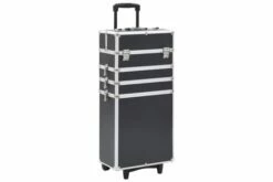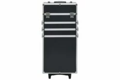 Vår sminketralle er den ideelle løsningen for å holde sminken din pent organisert. Bare pakk alt du trenger i denne praktiske sminkekofferten og ta den med deg! Sminkevognen er laget av tre, ABS-lakk og aluminium, og vil lett lagre sminken din og holde den i perfekt stand. Denne sminkekofferten har 4 etasjer og uttrekkbare skuffer i toppdekselet, og gir god lagringsplass for kosmetikk og skjønnhetsprodukter. Den har 4 avtagbare hjul, som gjør den enkel å flytte og ta med deg overalt hvor du drar! Farge: svart Materialer: aluminium, ABS og tre Mål: 37 x 22 x 78 cm (L x B x H) Med 4 etasjer og uttrekkbare skuffer i toppdekselet Med 4 avtagbare hjul