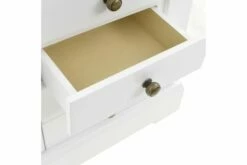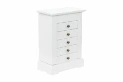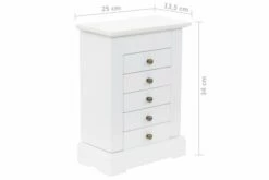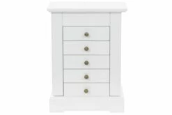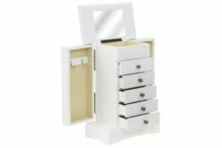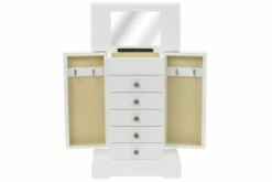 Dette smykkeskrinet er laget av MDF og har et glasspeil. Skrinet har en topp som kan løftes med et speil og en egen, liten del for smykker. Begge sider av skapet kan åpnes og her er det plass til å henge halskjeder, armbånd eller smykker på krokene. De 5 skuffene tilbyr god plass til kosmetikk-, hårpleie- og hudpleieprodukter. Når speilet ikke er i bruk, kan baksiden av lokket benyttes til små forsyninger.